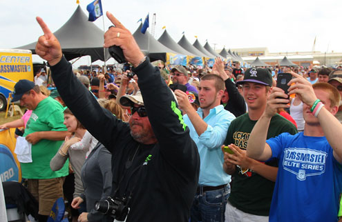 Broussard had a front row seat for Faircloth’s fishing prowess on Big Hill and gave him a thumbs up when he landed each of his fish. T-Roy also was seated in the front row of a crowd on Sunday that easily numbered 8,000 back at Orange (See Elite attendance records smashed in Orange) and he gave another thumbs up when his buddy hoisted the victor’s trophy in the air.