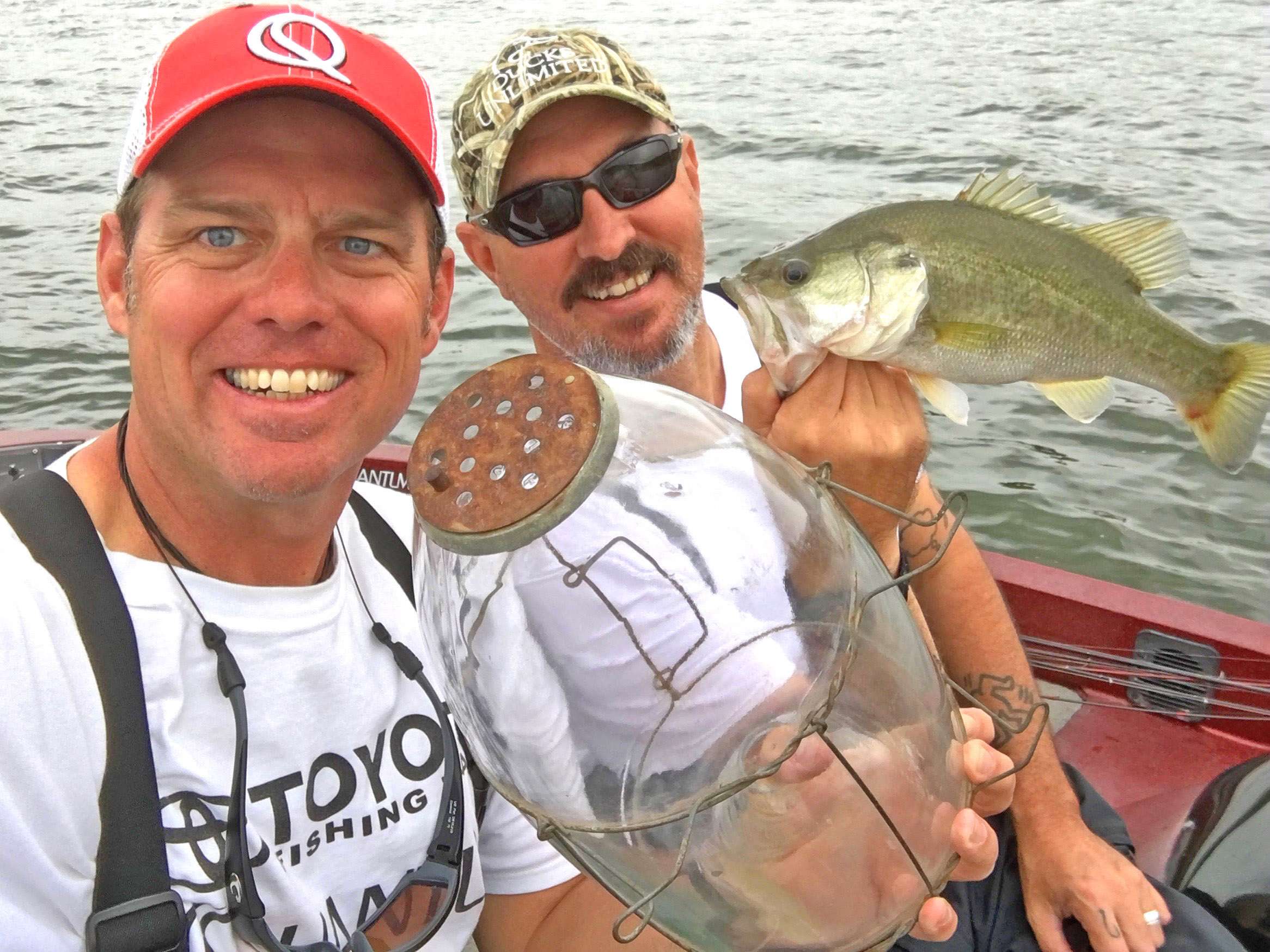 He showed up at my house Sunday morning with gifts. He has a habit of doing that before we go fishing. This time, a beer-can koozie from Chesney’s 2016 “Spread the Love” tour – and a very rare, antique piece of fishing tackle. A glass minnow trap made by the Shakespeare Company in Kalamazoo, Mich.