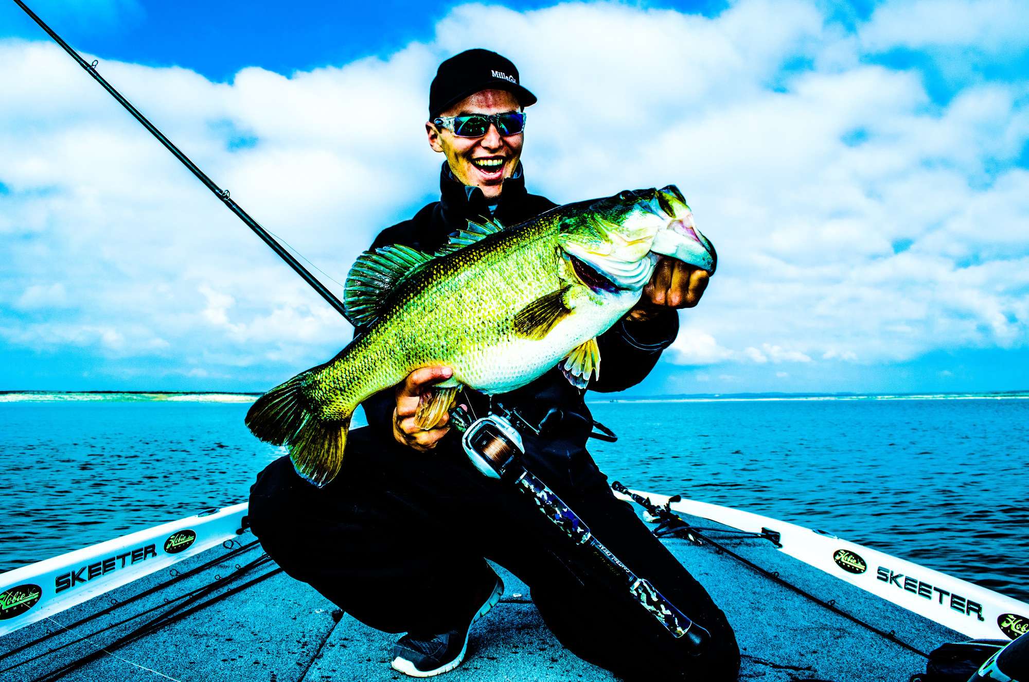 After an hour or so, I came across a 15-foot flat that then dropped down into a 30-foot creek bed then back up to 15 feet. It was a prime winter staging area for these Florida-strain bass. I positioned my Skeeter and made a cast with a Hog Farmer multi-rig lure up the middle of the creek bed. It hit the bottom and I made a short sharp rip with my Millerod ‘Rig Freak’ and went into a slow roll.