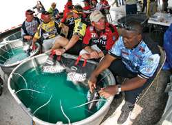 At BASS events, the fish are weighed in the mesh liner to reduce one more handling procedure. The liner is certified to weigh 0.35 pound.