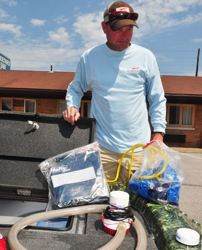 Below the back deck are three other items that he normally doesn’t carry. Two are to keep him on the fish, and one is for if the stuff hits the fan.