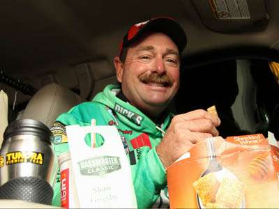 A wooden cross hangs on his rearview mirror, and remnants of a 32-ounce sweet tea he accidentally spilled in the cab of his truck this past Tuesday hang around on the carpet fibers beneath his feet. This is Grigsby’s 14th Bassmaster Classic, and still he admits he’s jittery to the point of scatterbrained here in the pre-dawn of a cold, windy and cloudy Day One.