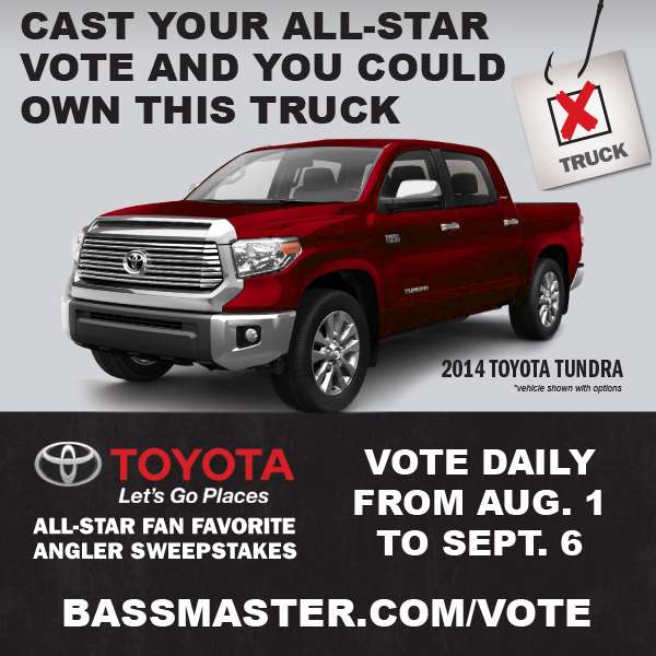Fans also have a chance to win just for voting, no matter which pros get in. Every person who casts a vote at Bassmaster.com/vote between now and Sept. 6 is entered into a sweepstakes. Fourteen names will be drawn, and the Toyota Fan finalists will then each be paired with one of the All-Star Week competitors. The fan who is paired with the winner of the event will take home a 2014 Toyota Tundra truck.