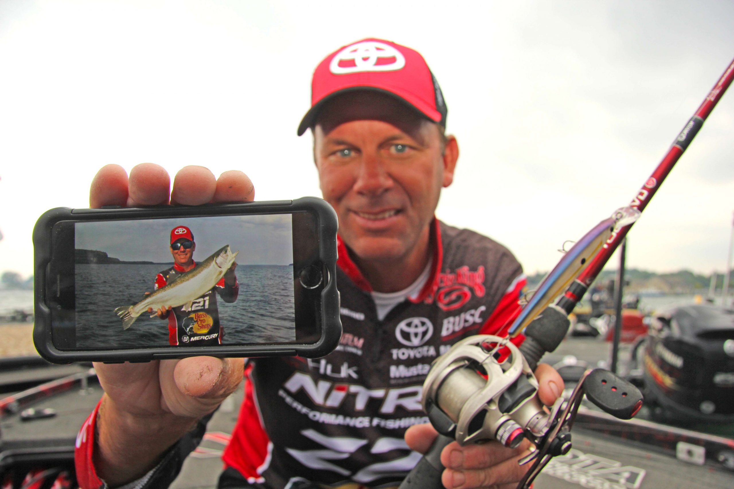 “This steelhead I caught today probably weighed 10 pounds, and it came from the same exact rocky shoal where I caught a legitimate 6-pound smallmouth in practice,” added VanDam, showing a photo on his cellphone of the steelhead after Day 1 weigh-in as a storm pushed toward Centerpointe Marina.