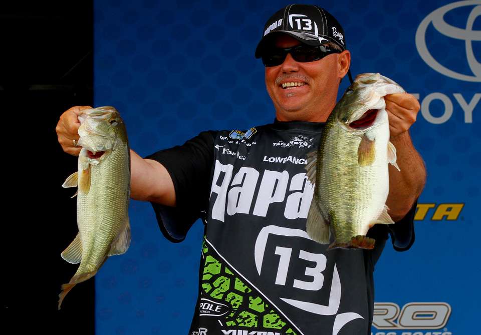 After weighing 19-1 for a total of 51-8, John Crews of Salem, Va., made up some ground after stumbling on Friday. He led on Day 1, but he only managed to catch 12 pounds on Friday and fell back in the standings. Crews made some fine-tuned adjustments on where he was fishing, and caught enough today to bump him back into third place.