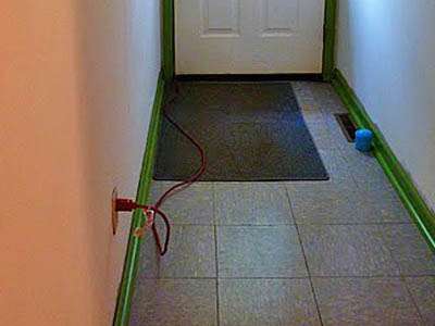 Over the orange extension cord running out from under the door, down the steps, around a post, under a pile of wood, through a bush, around a tree, under the laundry line, over a discarded tire, and finally up to the boat.