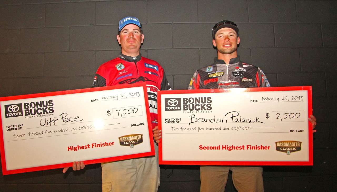 A giant cardboard paycheck brought a grin to Bassmaster Classic champion Cliff Pace’s face when he was presented $7,500 in Toyota Bonus Bucks money.
