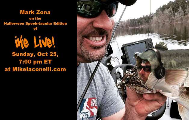 Mark Zona, The Bassmasters emcee and host of Zona’s Awesome Fishing show, joins Mike Iaconelli on the second annual Halloween Spook-tacular edition of Ike Live!, Sunday, Oct. 25, at 7 p.m. ET at MikeIaconelli.com.