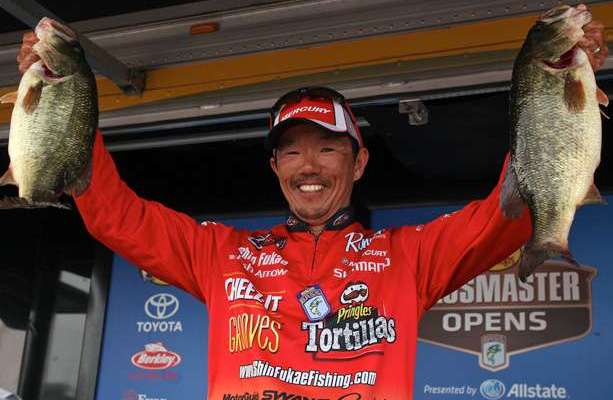 Palestine, Texas pro Shin Fukae became a two-time winner at Champlain Saturday by taking first place in the pro division of the Bass Pro Shops Northern Open with a three-day catch of 56 pounds, 13 ounces.