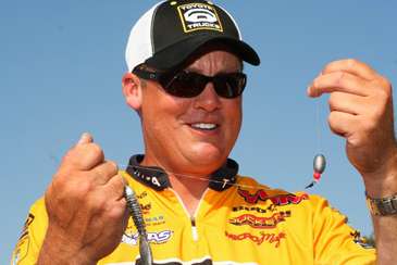 Few Bassmaster Elite Series anglers have a bigger appetite than Terry “Big Show” Scroggins. His grill skills are large, and so are his Carolina rig weights. In 2008, at Falcon Lake, Texas, Scroggins brought in the second largest 5-fish limit in BASS history with a Carolina rig. His five monsters totaled 44 pounds, 4 ounces. And right now, as bass all over America are in some phase of the spawn, few presentations work better than the “ball and chain.” There’s nothing fancy or secretive about Scroggins’ approach to Carolina rigging — just go big! “I don’t mess around with 1/2-ounce or 3/4-ounce weights unless I’m in really thick vegetation. If I can get away with it, in rocks, shellbeds, pea gravel or clay, I’m going to use a full 1-ounce lead egg sinker every time,” says Scroggins who has won more than a million dollars faster than just about anybody in the history of professional fishing. “There’s two reasons I use a big 1-ounce lead egg sinker on my Carolina rigs. First, with any water current at all, that egg-shaped weight will roll across the bottom, so you don’t have to impart a ton of unnatural action. You can sort of just hold your rod still and let the big heavy egg impart all the subtle action by rolling around. Second, when you do move it, that big 1-ounce weight creates a bigger disturbance. But I think the rolling action has as much to do with the success of it as the heaviness does,” said the longtime Team Toyota angler. Scroggins uses a 4-foot, 15-pound-test monofilament leader, and 20-pound-test mono for his main line. “You can buy a 1-ounce lead egg sinker at just about any tackle department in America. It’s what I grew up fishing with as a teenager in the St. Johns River 25 years ago,” said the always easygoing Scroggins. And today, at age 41, big lead eggs are working just fine for “Big Show” on bass fishing’s biggest stage.