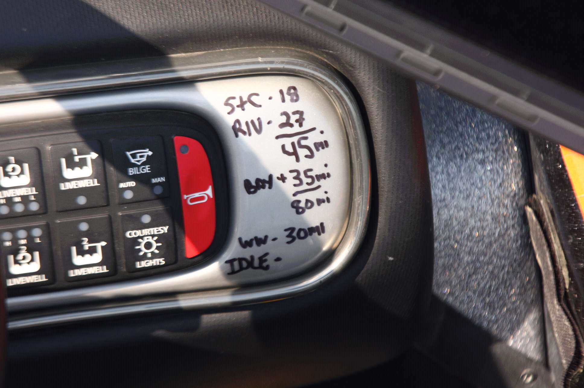 The numbers and abbreviations tell the story of just how long he’s traveling. His dashboard doubles as a travel log. It’s a crude approach that works given the circumstances. Paper gets wet and the pages can blow out of the boat. Any clear spot on the dash or steering wheel gets marked with abbreviations of the landmarks and the mileage.