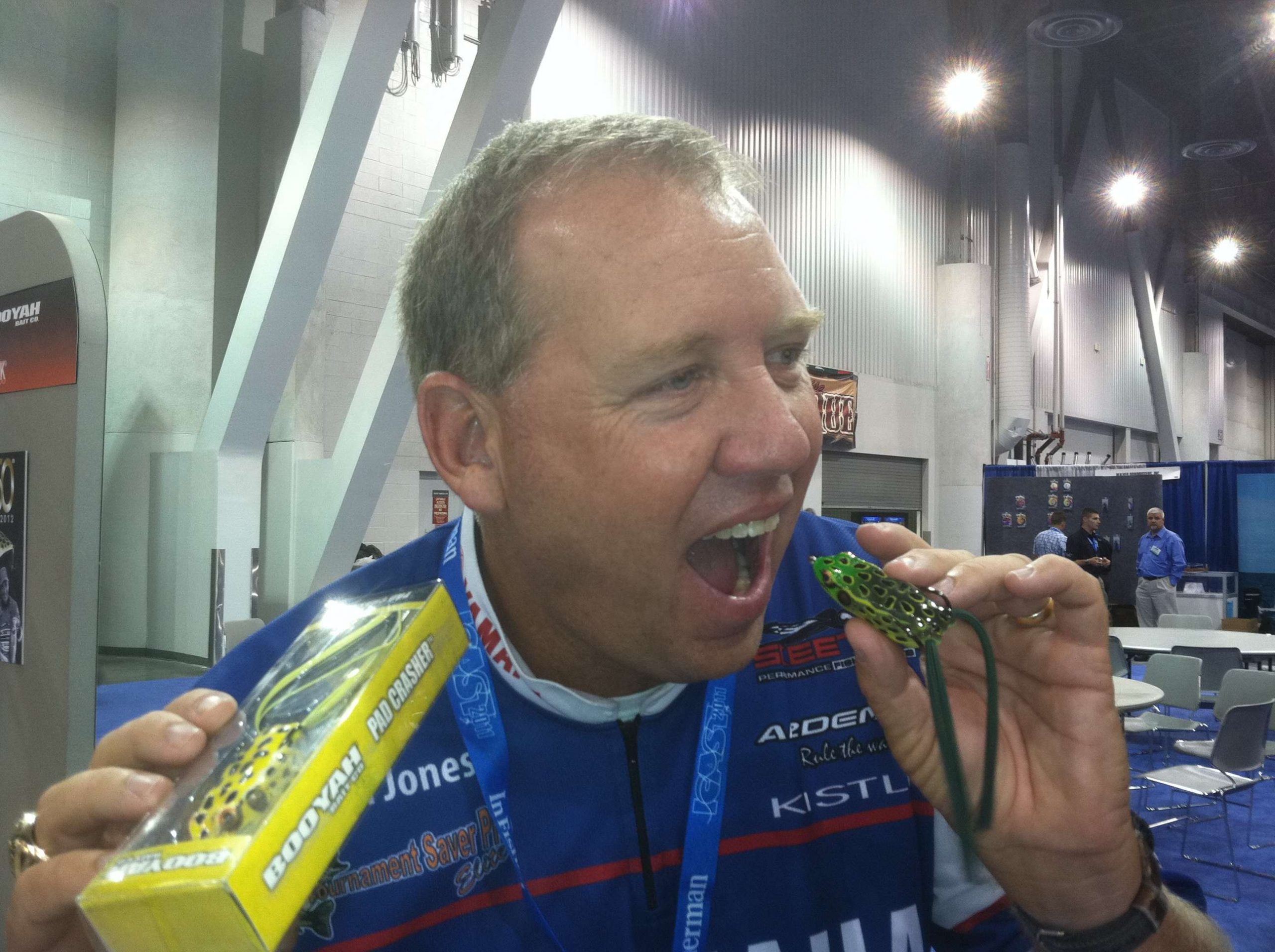 I’d like to share some of the products from ICAST that I’m excited about. I’m pretending to eat Booyah’s new Pad Crasher frog in the first photo. Another bait that I’m really excited about is the bigger, deeper diving Bomber BD8. It dives 19 to 20 feet. I also liked the reels from EverCast (check out the photo to the left).