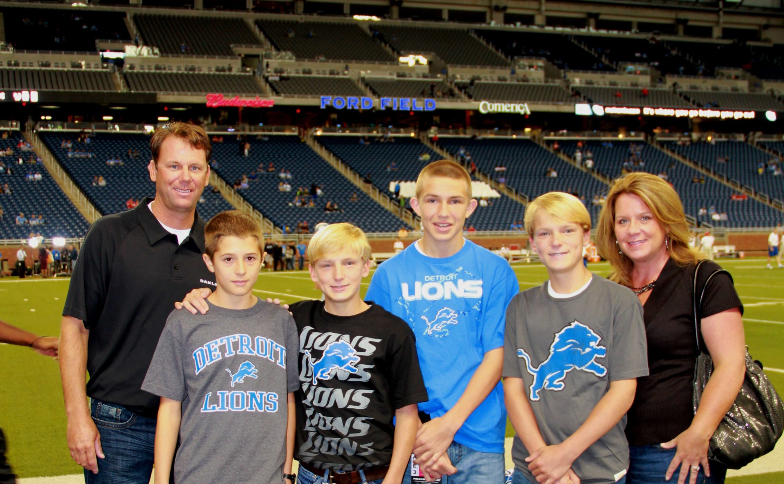 Afterwards, Coach Schwartz gave me tickets for my family to sit in his suite at last Sunday’s Lions game against the Kansas City Chiefs. If that wasn’t cool enough, we also got to meet singers Kid Rock and Bob Seegar who were in the suite next to us. We also got to go down on the field during the pre-game warm-ups and talk to some players. It was quite a thrill for my boys to see the field and the players that close.