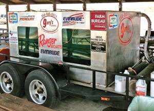 Purchased from Gary’s Marine with funds from a $13,400 fish-care grant from BASS, the facility is constructed of stainless steel and rides on a heavy-duty tandem axle trailer. Its oxygen and aeration systems were designed with assistance from Texas Parks and Wildlife and can comfortably accommodate up to 800 pounds of bass.