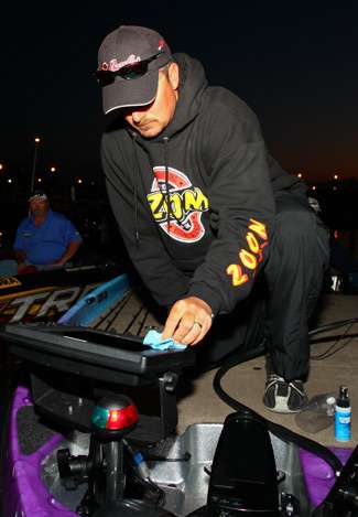 He doesn't say much. His head is already in the contest. He watches the boat traffic, 99 boats bobbing within feet of each other, some with engines puttering. Although Elite pros handle a boat like they were born to it, that doesn't mean they aren't careful.