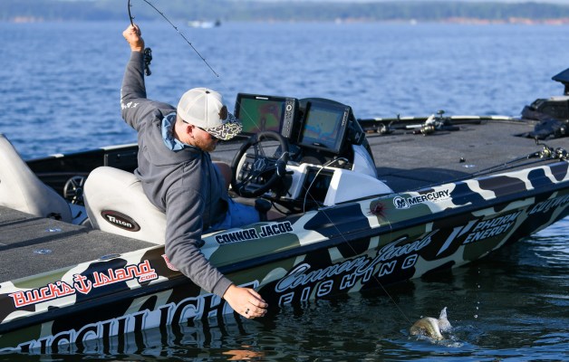 He quickly hooked up with another bass while working his jerkbait around a stretch of docks.