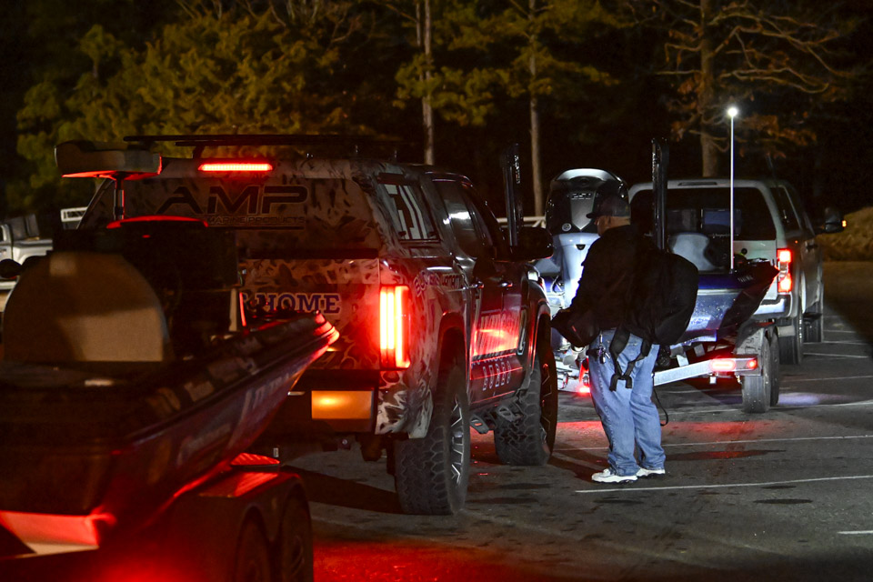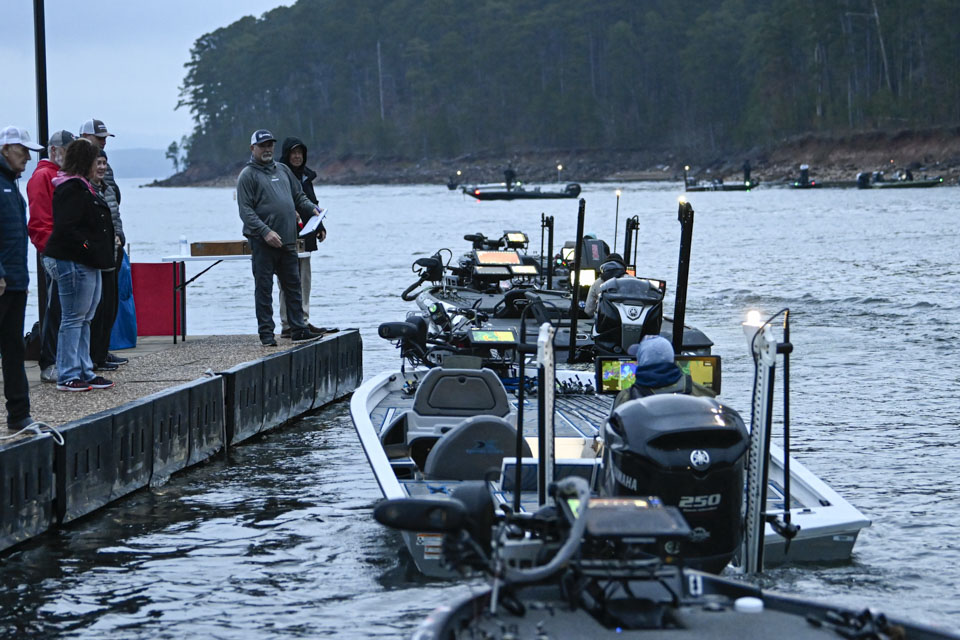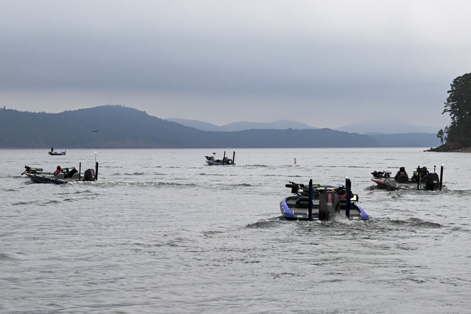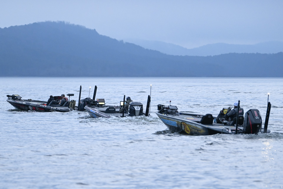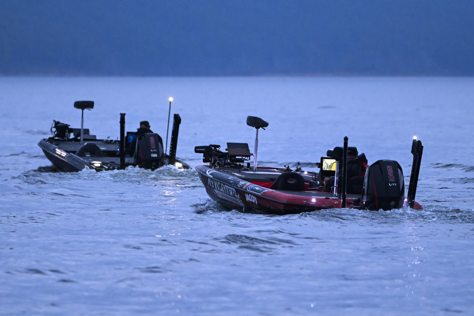 At dawn, Lake Ouachita awakens with anglers blasting off on Day 2 of the St. Croix Bassmaster Open at Lake Ouachita presented by SEVIIN.