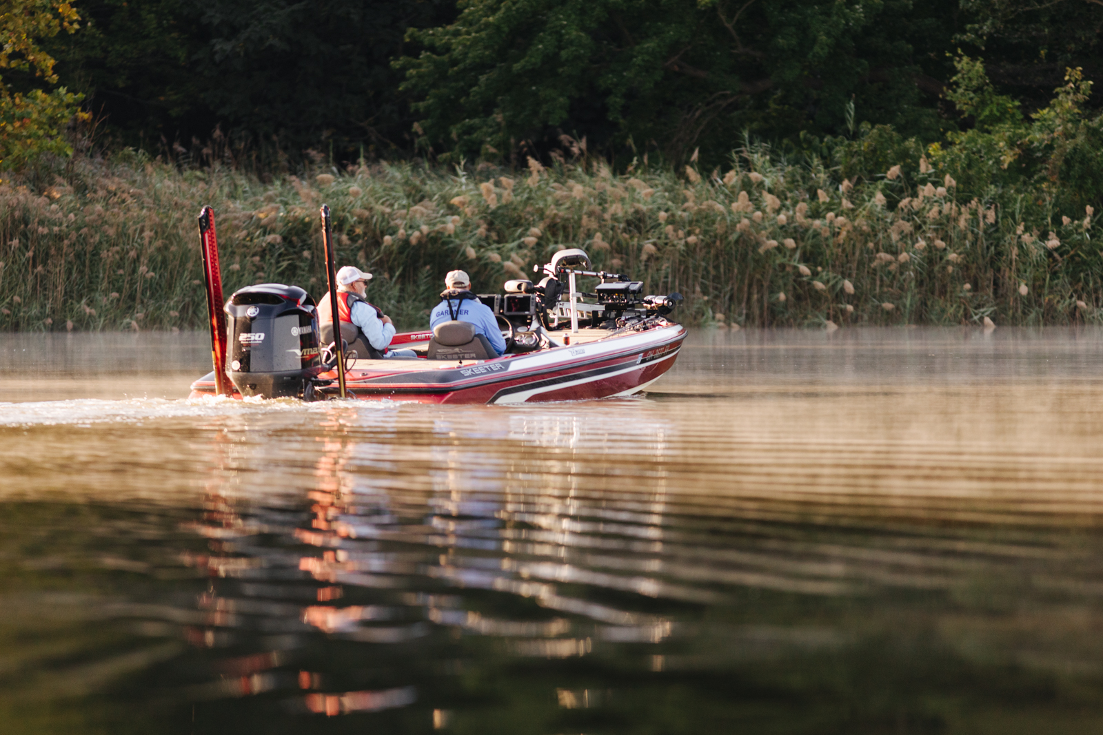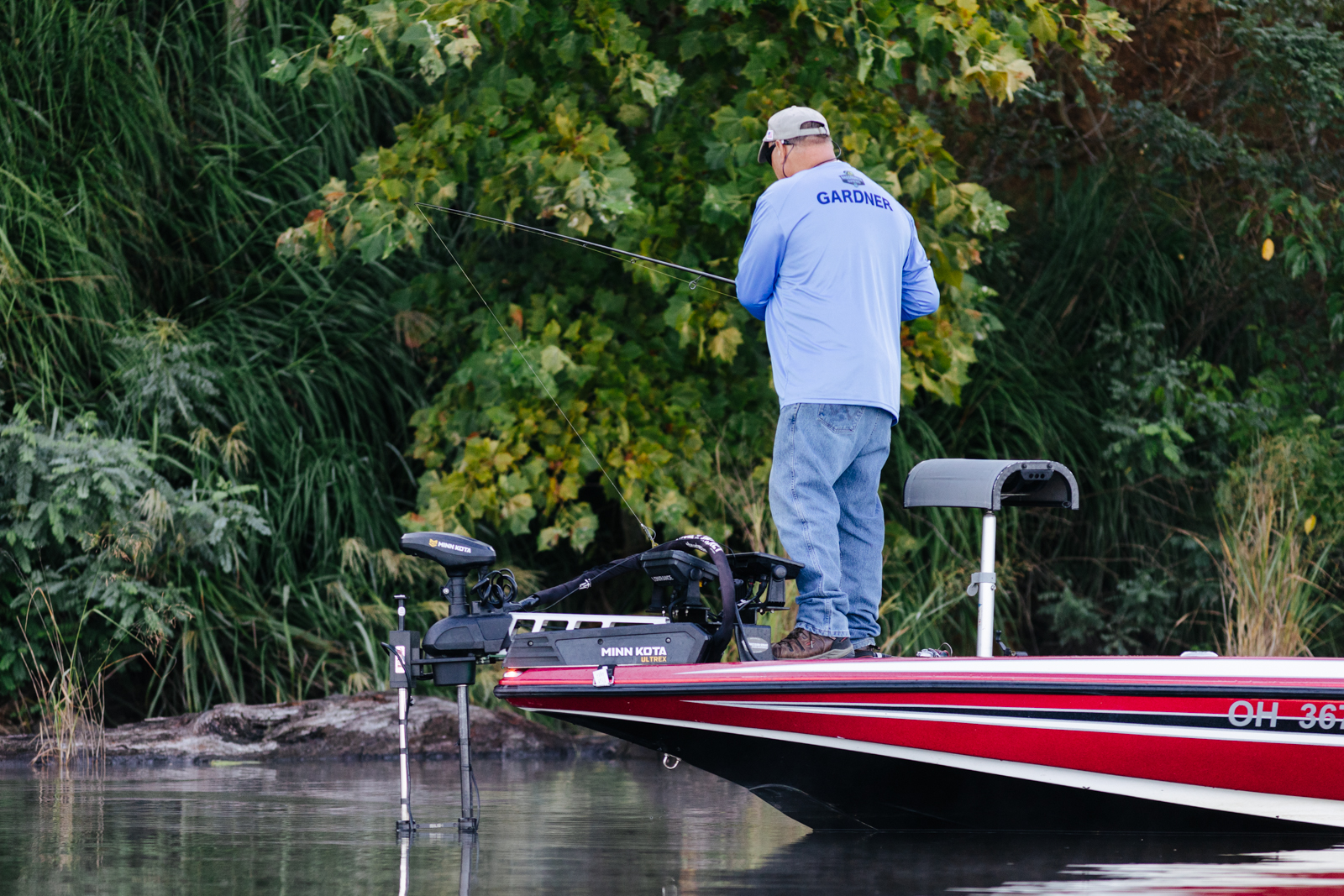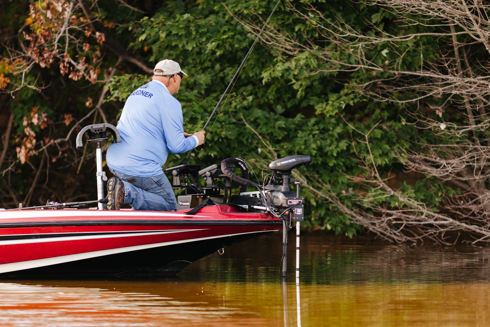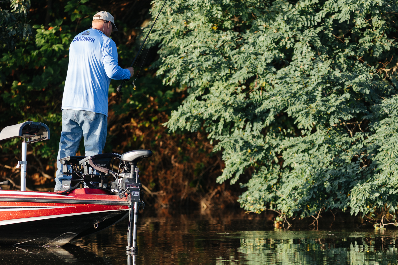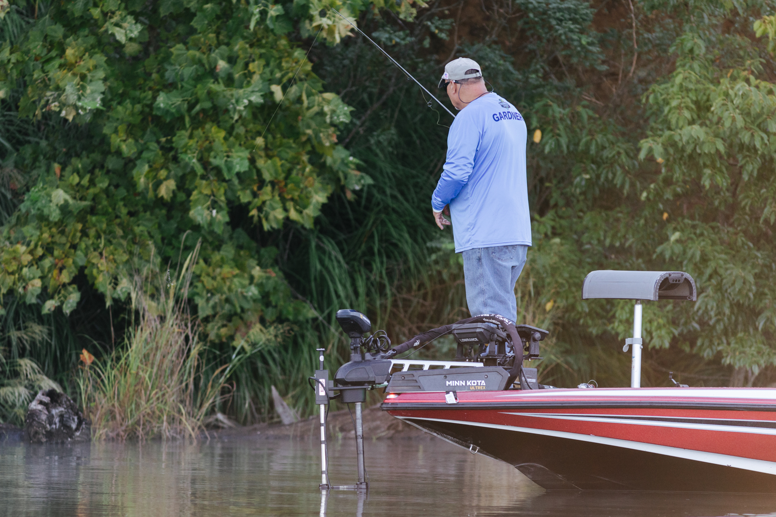 Leading into Day Two of the 2022 St. Croix Bassmaster Northern Open, Jody Gardner, begins the morning flipping wood structure tight along the bank.