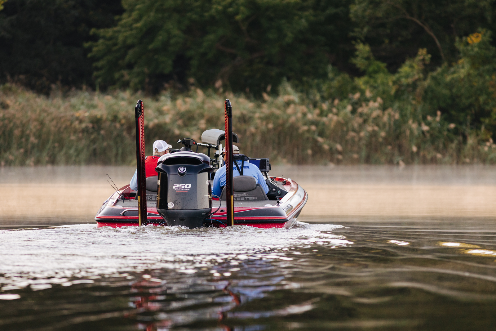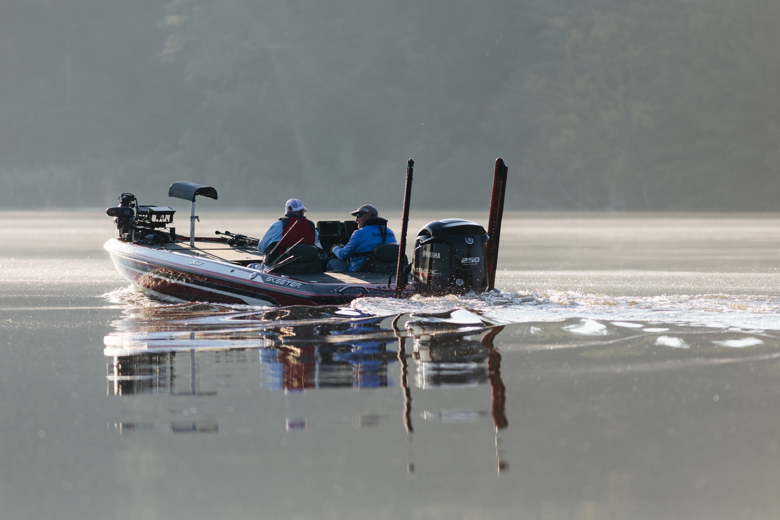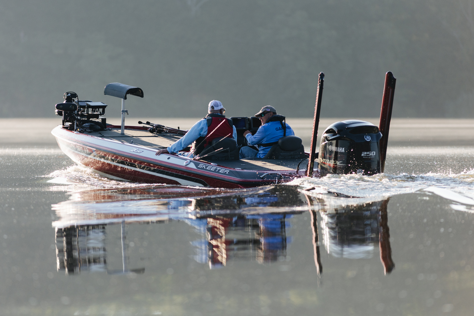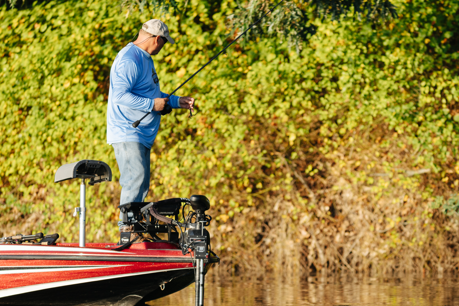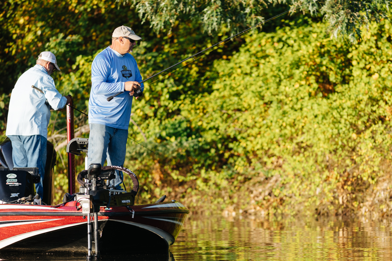 Leading into Day Two of the 2022 St. Croix Bassmaster Northern Open, Jody Gardner, begins the morning flipping wood structure tight along the bank.