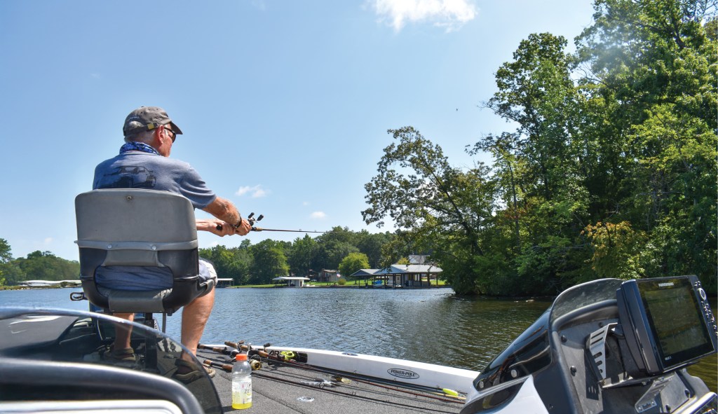 “The water is so darn hot right now,” he notes. “I don’t believe the bass are going to move around and chase shad in water this hot. It stresses them out too much. That’s why they hang around baitfish schools.”
