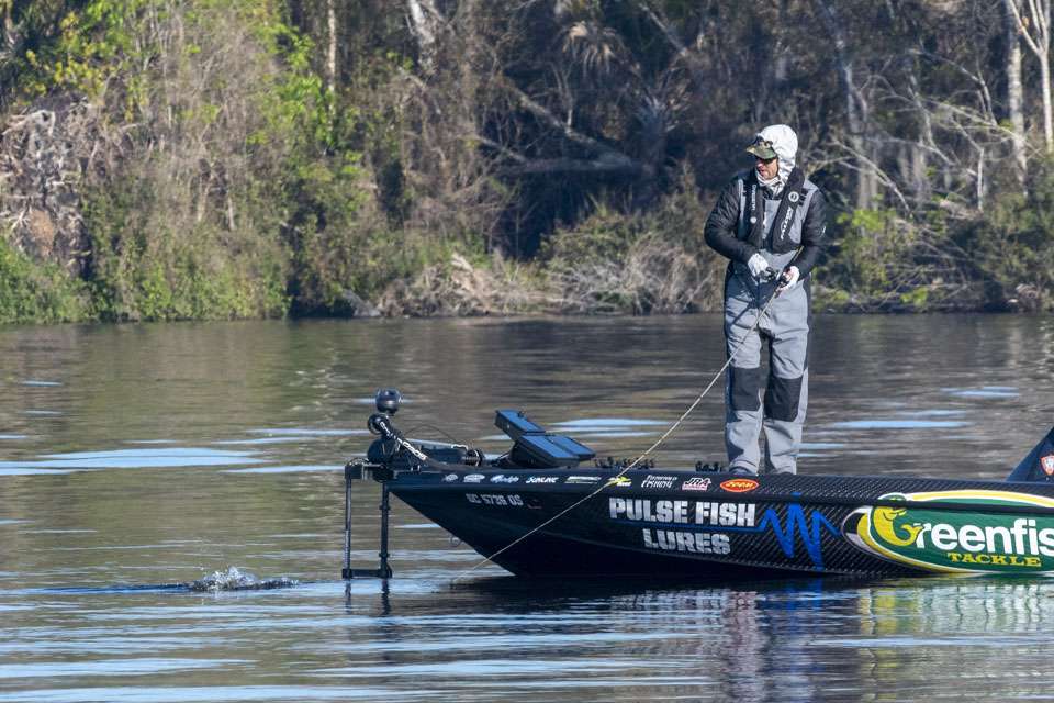 Bryan New started Day 1 working a fog-covered point on the St. Johns River between Palatka and Little Lake George.