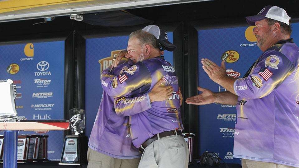 Garry Mason congratulates angler John Garrett at the Bassmaster College Classic Bracket.