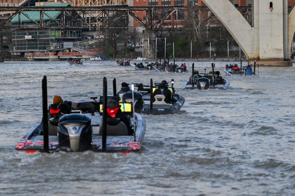 7:45 a.m. — As the pack of boats sped downstream toward Loudon, at least one of them kept going. Kyle Welcher headed toward Tellico, explaining why in this quote from photographer Andy Crawford. “Tellico was packed during practice, and he thinks most of the field will be down there.” That said, Welcher laughed and said he may not fish the tournament where he started practice.