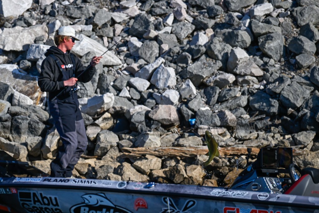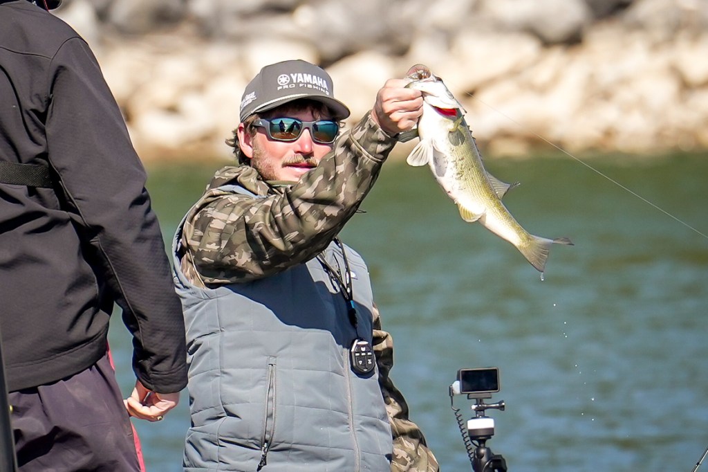 9:45 a.m. — Photographer Solomon Glenn checked in with this report for JT Thompkins. “He is running around hitting clay points with nearby pea gravel and chunk rock, targeting mostly smallmouth,” Solomon said. “He’s found several good schools and caught a five-pounder, using a coverage bait.”