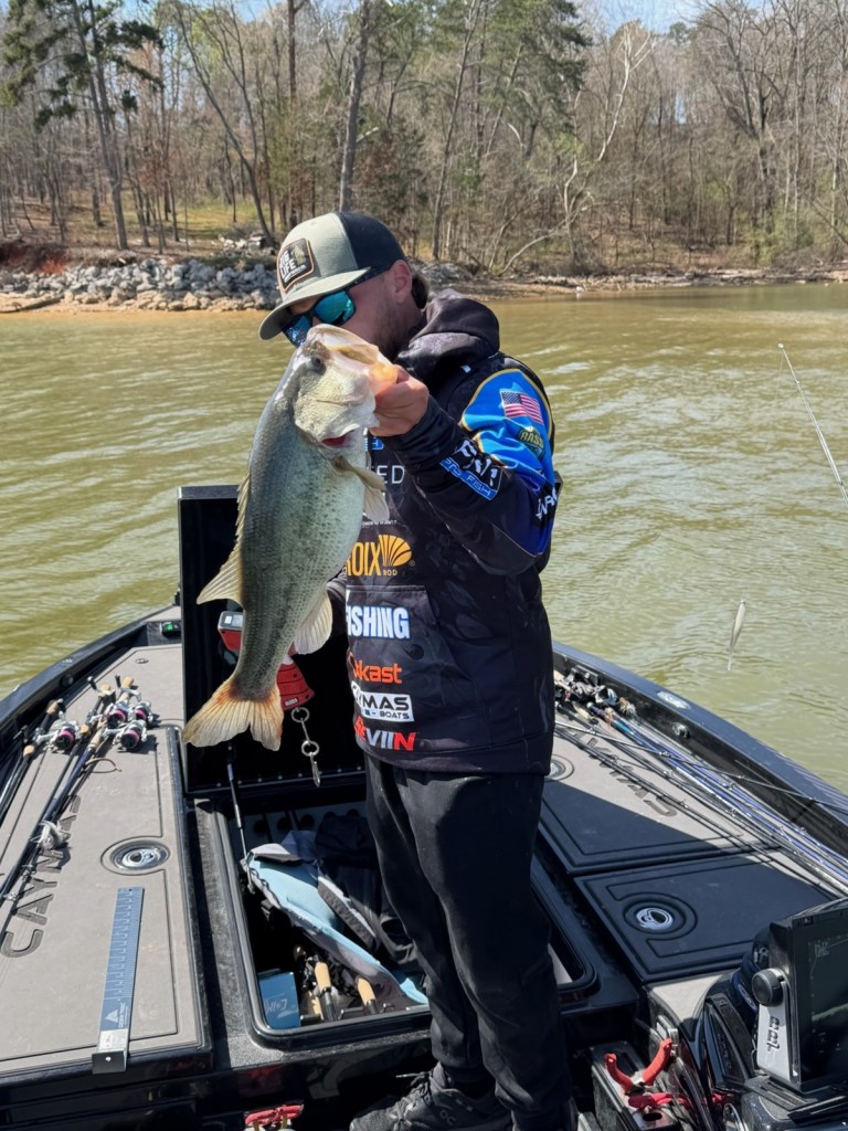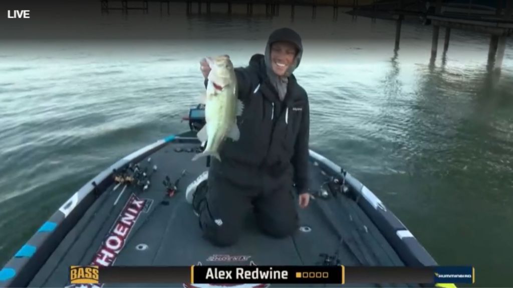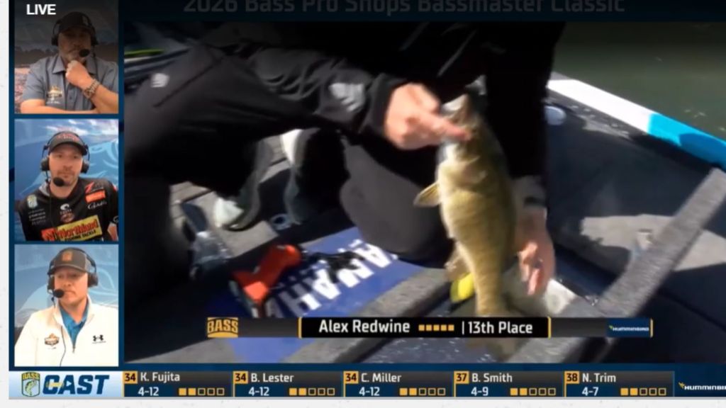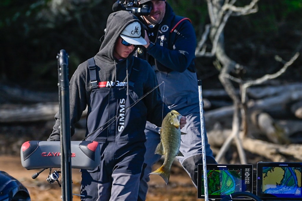 11:57 a.m. — Alex Redwine has multiple things going on today. What do they have in common? None of his fish seem to be on Ozempic. Early this morning we saw him catch a near 4-pound largemouth to start the day, and he just culled with a thick smallmouth.