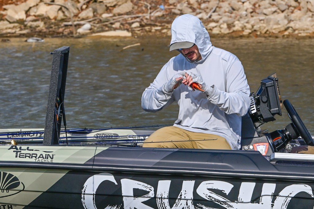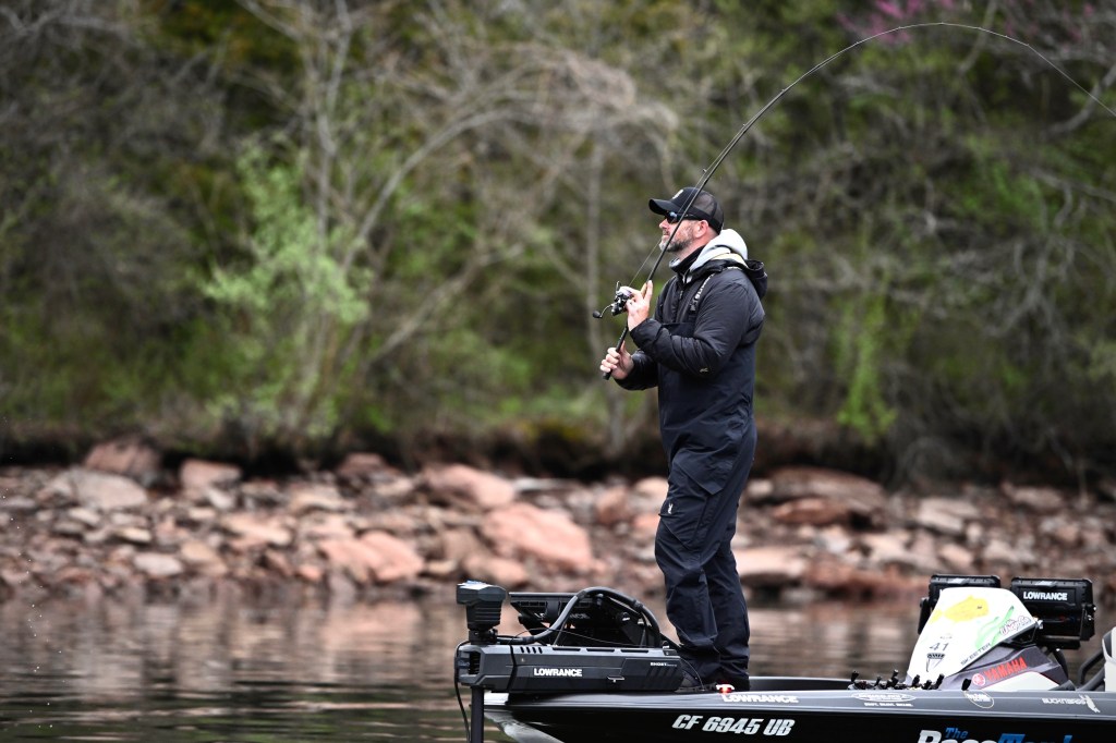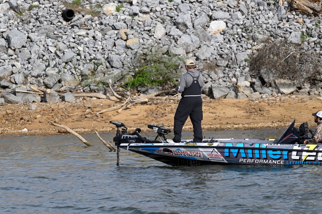 8:30 a.m. — Kyle Jesse is riding along with Brandon Lester, a pre-tournament favorite for his Tennessee roots. Lester had already made numerous tops that he didn’t have time to fish during the three days of unofficial practice. The hope is that he will find a specific area that he can hunker down in. the 10-time Classic qualifier has found water temperatures ranging from 56 to 65 degrees. “The backs of windblown creeks have the warmest water,” Lester said.