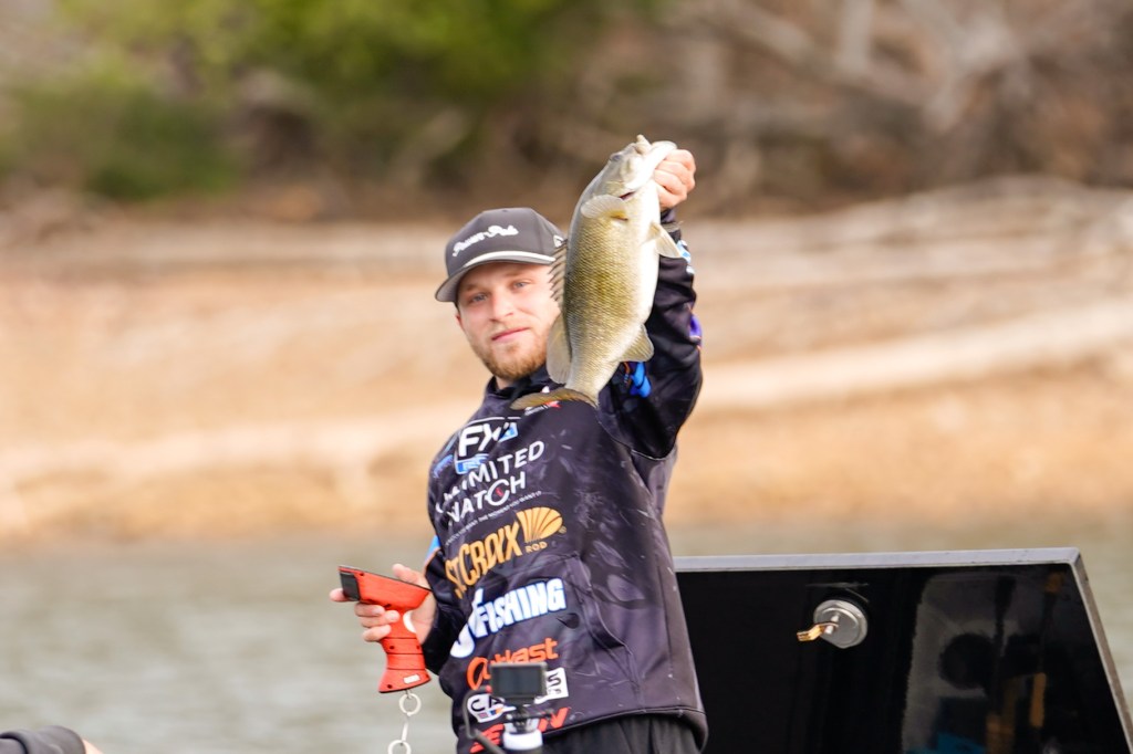 10:08 a.m. — Photographer Andy Crawford reports that Dylan Nutt just made a big upgrade when he swung a 3 1/2 pound smallmouth into the boat. He said it moved him up a pound and a quarter.