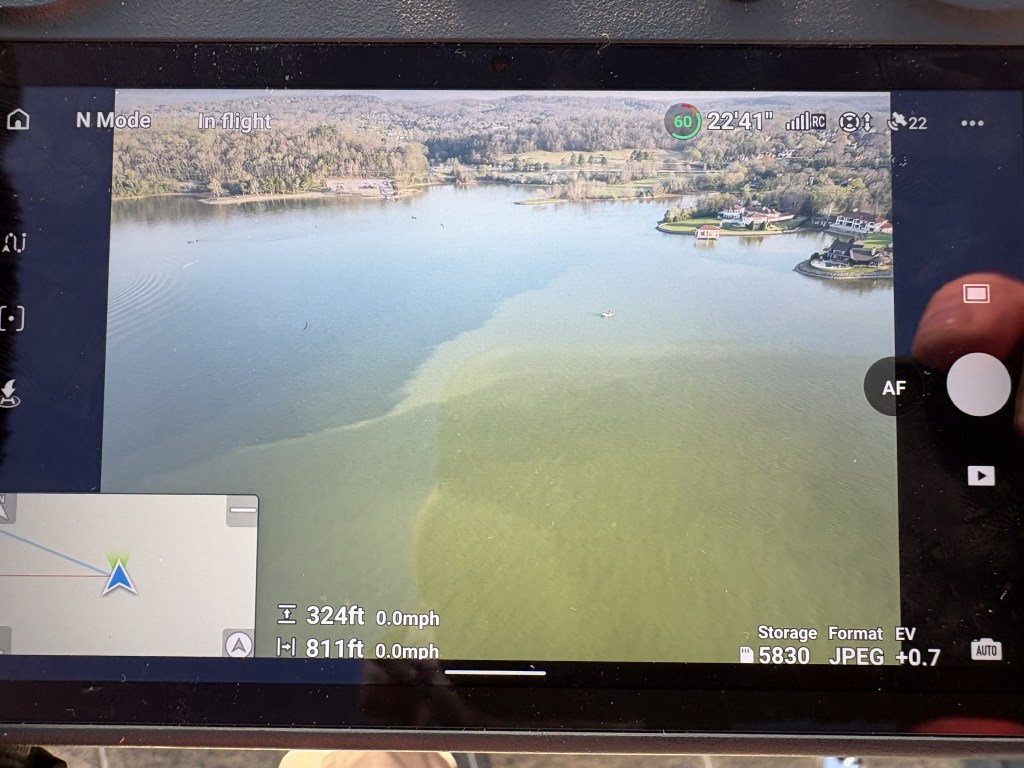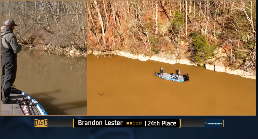 10:17 a.m. — Brandon Lester, who finished 6th in both of the past Knoxville Classics, is banking on largemouths in chocolatey water, as seen in a drone shot. There’s been lots of talk about the importance of water clarity. It differs between the two lakes and changed in some areas due to Wednesday night’s rain. It may change again in certain areas before this event is over.
