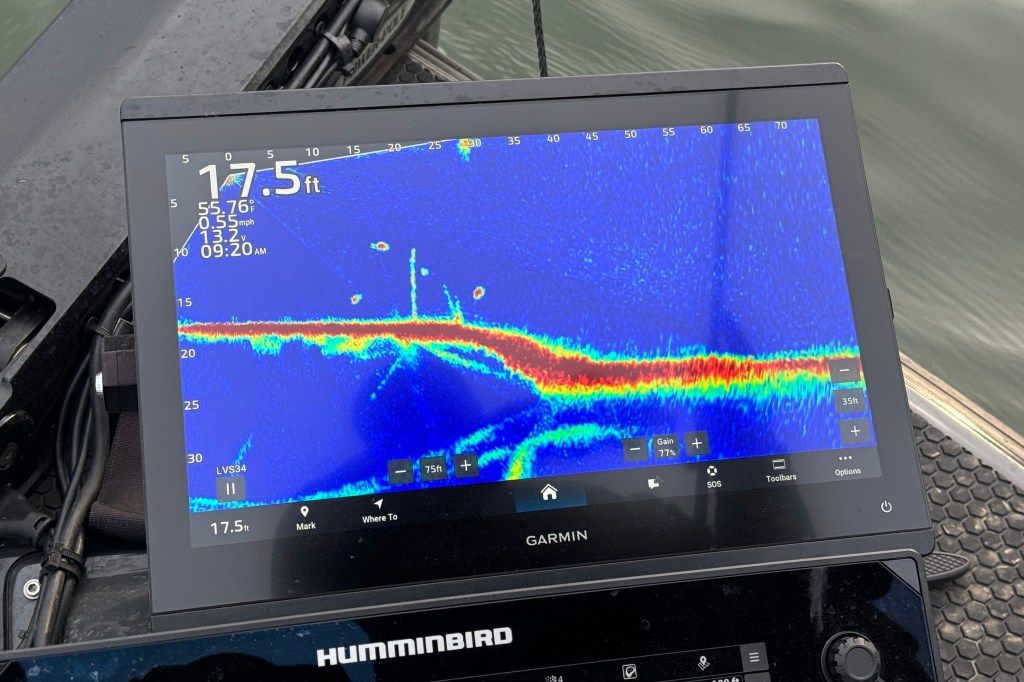 9:45 a.m. — Photographer Shane Durrance got inside the boat of Nick Trim to grab this pic of his screen. “Trim has found some giant smallmouth” Shane said. “The only problem is they are just chasing his bait and refusing to commit. He said they are all over four pounds. He is trying to decide whether to come back to this spot or not during the tournament.”