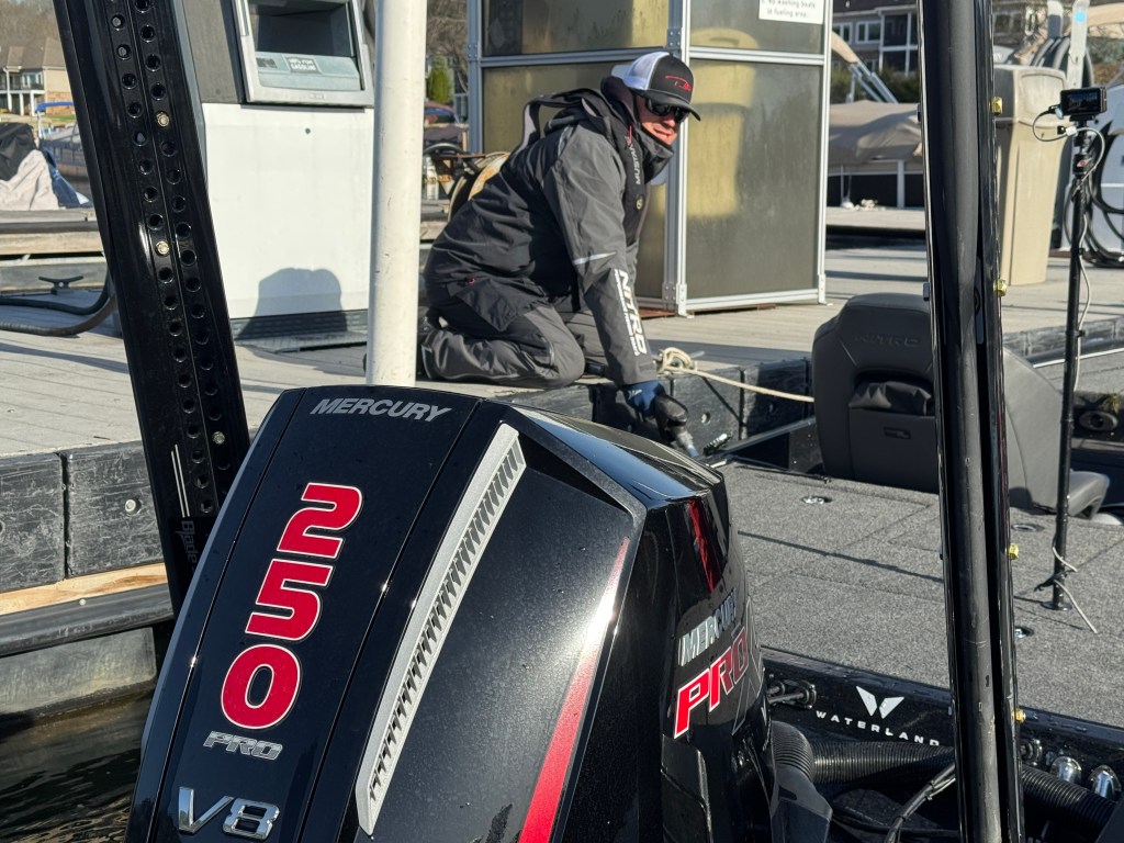 10:02 a.m. — One of the strategic conundrums for anglers making long runs this week will be whether they need to refuel – and, if so, at what point in the day. Photographer Shane Durrance found Will Davis Jr. refueling early, with 10 pounds in the livewell. He’s catching fish on a blade bait, but says that each spot is good for only one fish. After the first one bites, he can’t get another one to commit. That means lots of running and gunning and lots of gas burned.