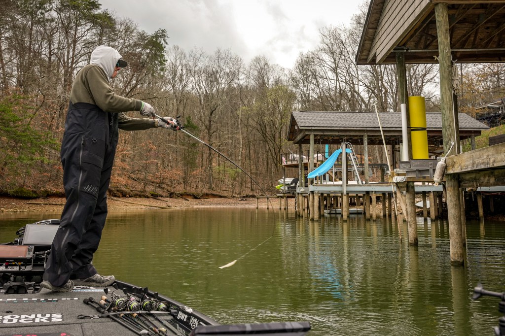 2:31 p.m. — Bassmaster photographer Andy Crawford followed Yui Aoki, currently is in fourth place on BASSTrakk, part of the day, and he said the young Opens angler seems to have been focusing on cleaner water in Loudon. The water in the backs of the creeks were muddier than that closer to the main Tennessee River channel. Aoki did fish some docks and underwater structure inside a creek — but just inside where the water started cleaning up a bit.