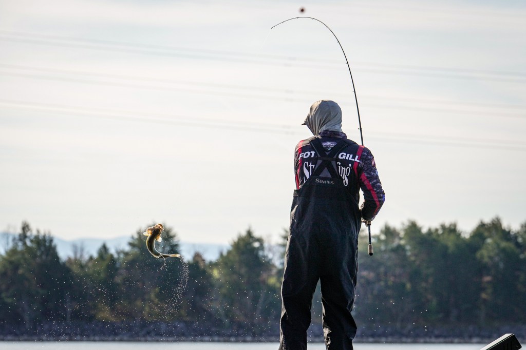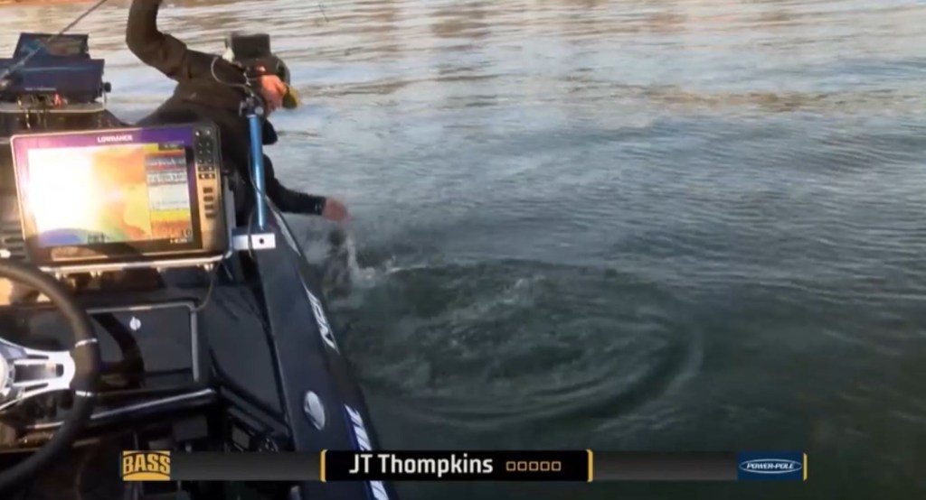 8:26 a.m. — JT Thompkins, who entered the day in 6th place, about 2 ½ pounds back, started off the day by jerkbaiting up a 3-14 smallmouth. It wasn’t a quick fight – at one point the fish had run under the boat and was jumping on the other side. He also reported that he had at least three bass of the same size or bigger fighting for the bait.