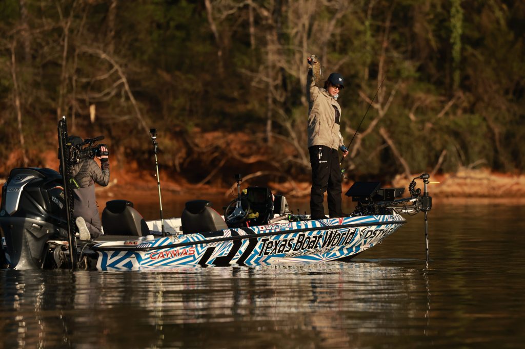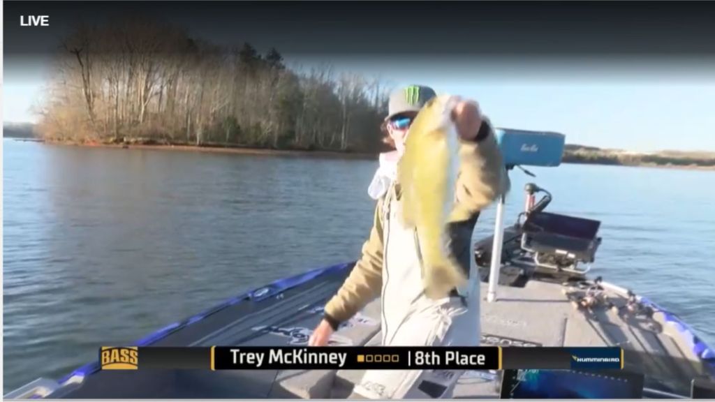 9 a.m. — Bryant Smith is in an area where he is seeing a ton of fish, and he just told Dalton Tumblin they’re big ones. “It’s a little cove off to the side of the main channel. Problem is he can’t seem to keep them biting,” Dalton reported. “They constantly follow my swimbait and jerkbait to the boat but just won’t commit to it” Smith said. Dalton added that Smith is loving what he’s seeing on his forward-facing sonar, just trying to figure out what will get them fired up.