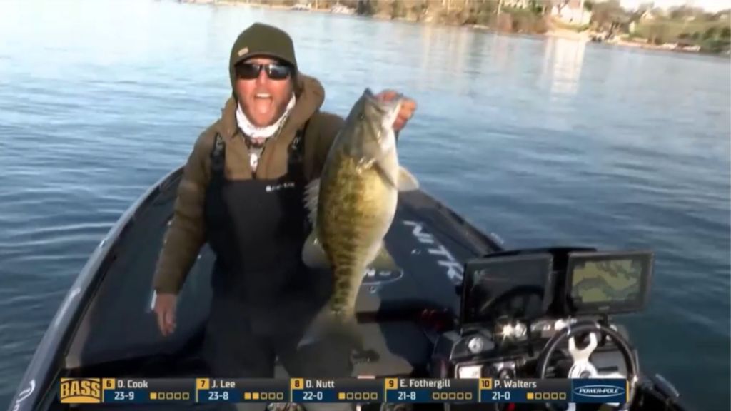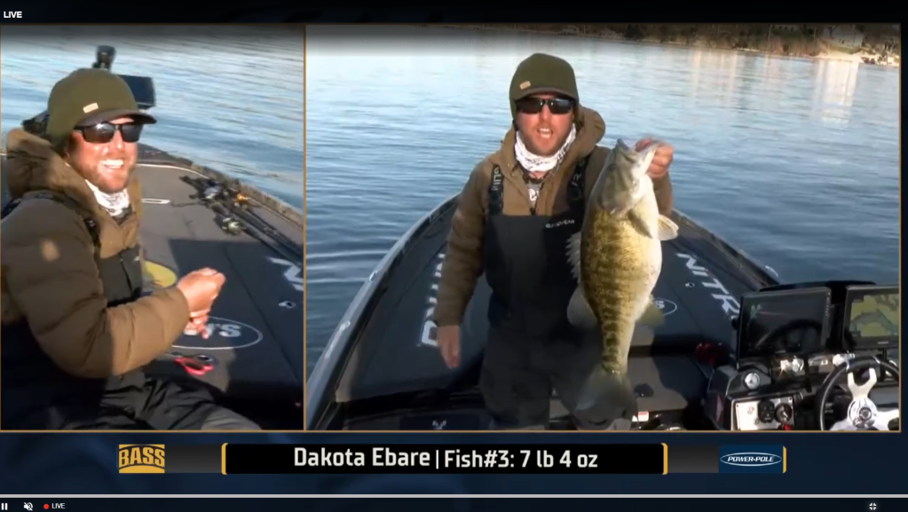 10:50 a.m. — In case you missed it, check out the video of Dakota Ebare’s massive Day 2 morning bass. It’s all about the giggle.