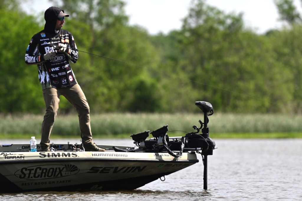 7:02 a.m. — Anaya said he’s going out with four rods on the deck today: a frog, a swim jig, a vibrating jig and a jerkbait. He may have some sort of dice or minnow in the rod box, and indeed others are likely using them, but for now it’s all about power fishing. He learned a lot from one of the greatest junk fishermen in history – Gerald Swindle – and while there aren’t a dozen sticks ready to go, he looks to fish by feel and circumstances today.