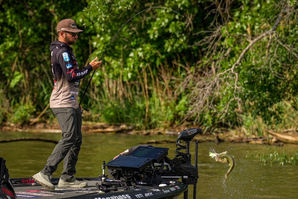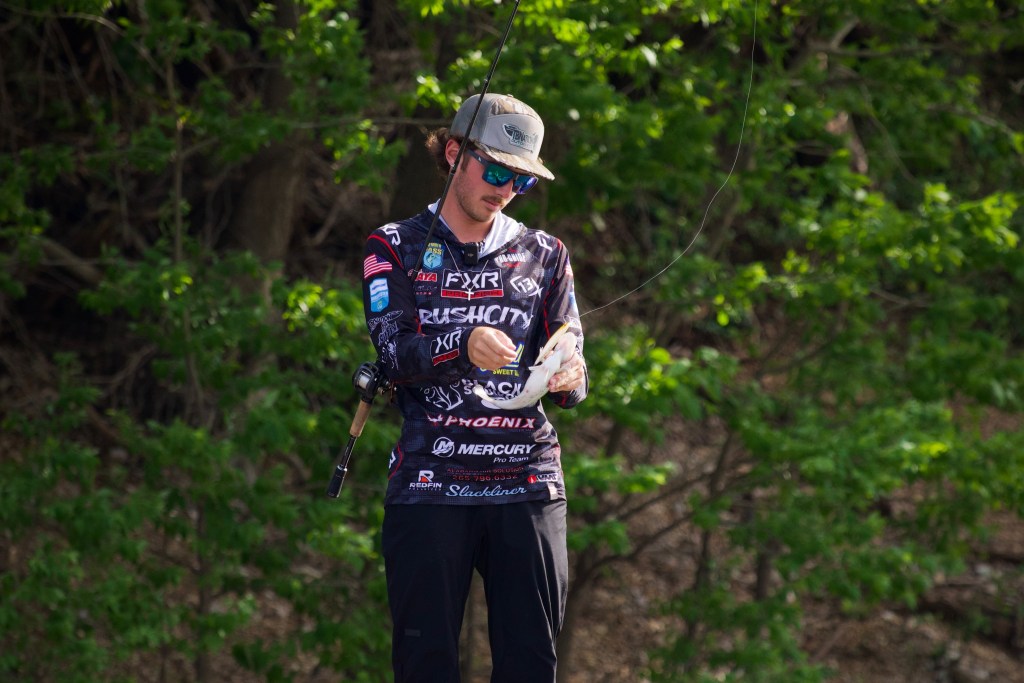 7:47 a.m. — With spotted bass number three, Fisher Anaya revealed his strategy: He’s going to catch a limit of spots to calm his nerves and then go hunting for bigger largemouths. His trio total 6 pounds 12 ounces. “I need 2 more pounds and I make the cut,” he said.