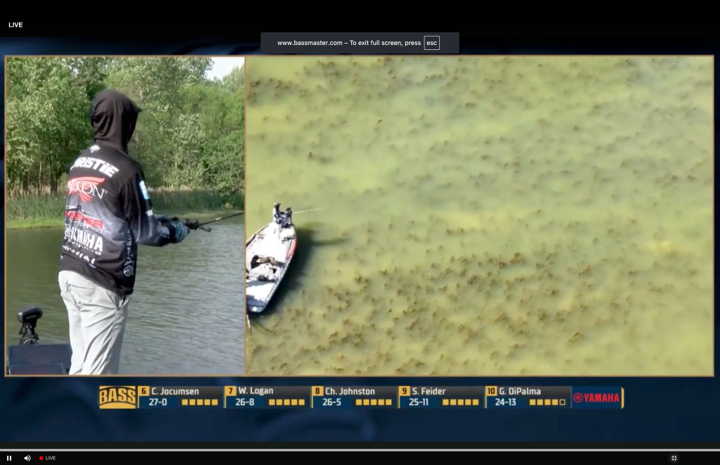 9:59 a.m. — If you are a fishing freak and not watching Live now, drop whatever you are doing and tune in. There’s aerial coverage of Jason Christie’s big grass flat and even from a distance the strikes are unmistakable and heart-stopping. Whatever you think of the rise of technology in fishing, “being there” has never been better.
