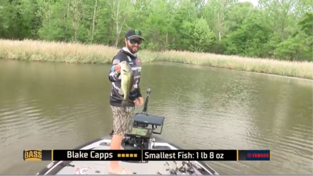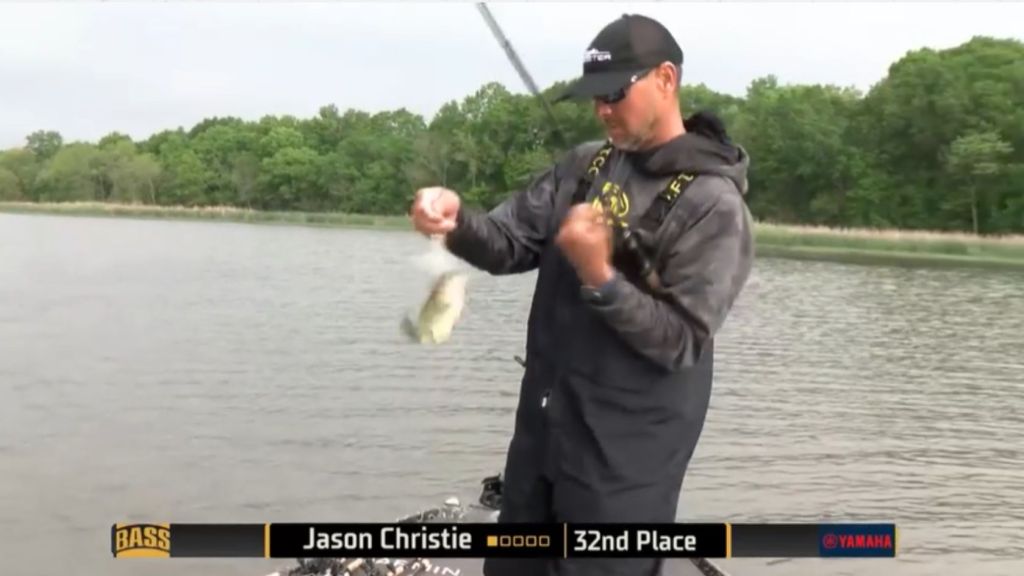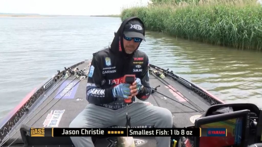 9:08 a.m. — Jason Christie started today in the same spot where he started yesterday and quickly got on the board. Somewhat surprisingly, he started with the buzzbait, the lure that produced smaller fish for him yesterday, not the Spook which produced better quality. Then he switched and quickly added a second fish. It’s game on. At least for now he has the area to himself.