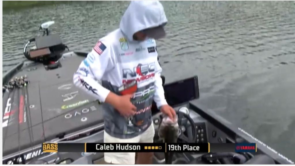 11:33 a.m. — Caleb Hudson, who caught a 5-4 yesterday, just caught one a pound heavier. He played it gingerly, got it into the boat, and the worm fell right out of his quarry’s mouth. That’s living right. It was his fifth fish and now he’ll have to work on culling because he’s still behind unofficial leader Fisher Anaya by over 3 pounds – with a couple of others in between them.