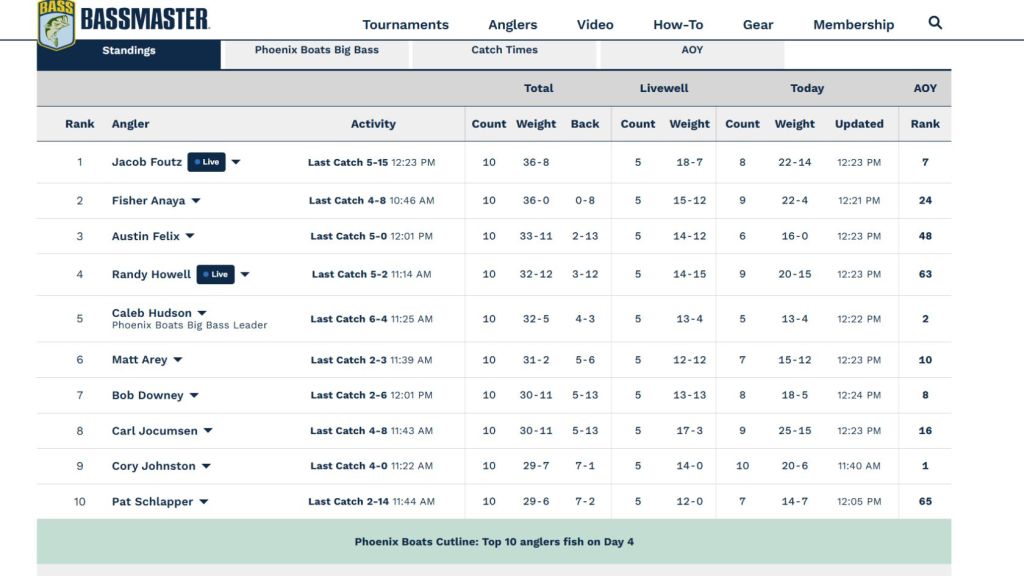 12:28 p.m. — For the first time in a long time, we have a new leader. With a nearly 6-pounder, Jacob Foutz has topped 18 pounds for the second straight day and has surged past Fisher Anaya by half a pound.