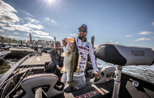 Day 1 leader Drew Cook shows off two of the massive bass that anchored his Thursday success. Update by Chris McCabe
